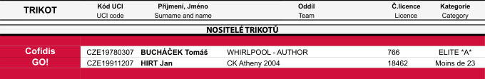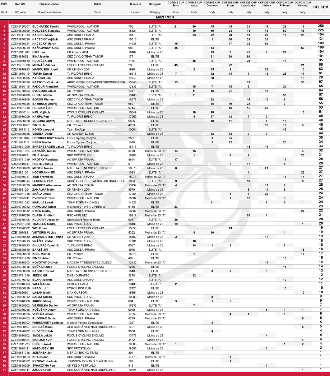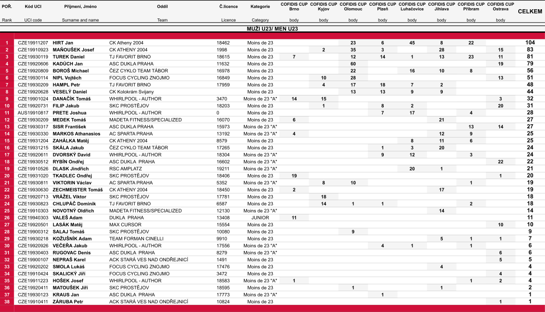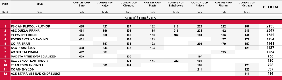 Průběžné výsledky po závodě Cofidis cup Ostrava